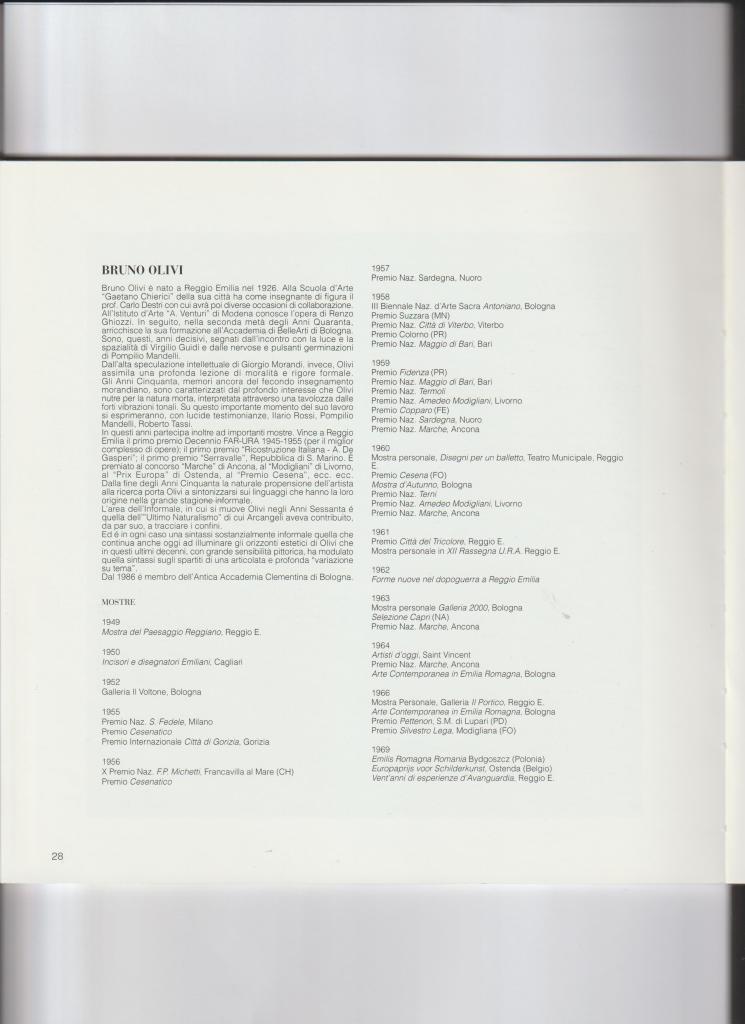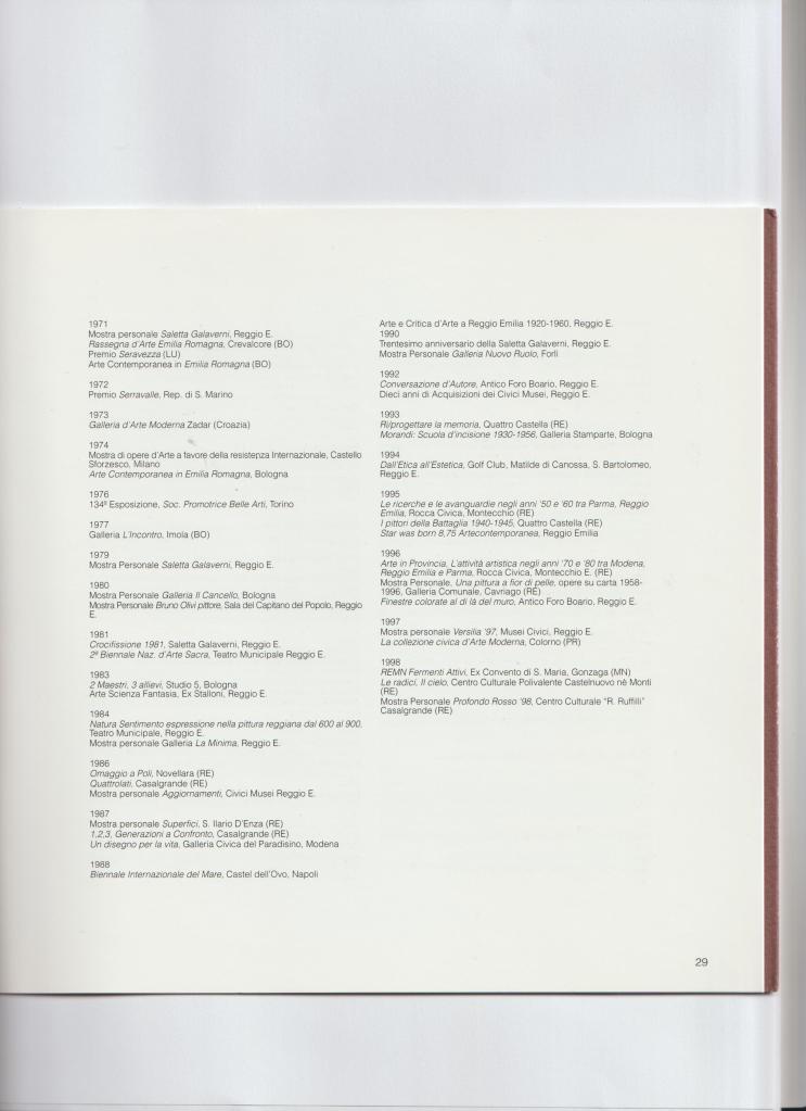 20102010 – Musei Civici di RE – a cura di Claudio Cerritelli2019 – Complesso Monumentale dell’Ospitale – Rubiera (RE) – a cura di Sandro Parmiggiani1963 – Galleria 2000 Bologna – testo di Eugenio Riccomini1969 – Prix Europe Peinture Ostenda1971 – Saletta Galaverni (RE) -testo di Ilario Rossi1971 – Crevalcore (BO) – testo di Franco Solmi1980 (RE) – testo di Roberto Tassi1984 – Galleria la Minima Reggio Emilia – testo di Corrado Costa1986 – Musei Civici (RE) – testo di Marcello Venturoli1987 – Biblioteca di S. Ilario (RE) – testo di Toti Scialoja1993 – Antico Foro Boario (RE) – a cura di Umberto Nobili1996 – Cavriago (RE) – testo di Sandro Parmiggiani1997 – Civici Musei (RE) – testo di Rita Bentini , testimonianza di Pompilio Mandelli1998 – Casalgrande (RE) – testo di Giuseppe Berti2000 – Palazzo Magnani (RE) – a cura di Sandro Parmiggiani2002 – saggio di Corrado e Stefania Rabotti2003 – Parma, Associazione Remo Gaibazzi – Cura del catalogo: Sandro Parmiggiani2004 – Palazzo Magnani, a cura di Sandro Parmiggiani2006 – Palazzo Magnani – La Collezione della Provincia di Reggio Emilia2010 – Bibbiano (RE) testo di Alfredo Gianolio2010 – articolo di Eleonora Viti2013 – Galleria Rezarte – a cura di Alberto Agazzani2016 – saggio di Rosanna Maseroli Bertolotti2018 – testo di Massimo Mussini2020- Grizzana Morandi, Fienili del Campiaro – a cura di A. Mazza, M. Nottoli, A. RodellaComune di Grizzana Morandi (BO), Fienili del Campiaro 2021, a cura di A. Mazza, M. Nottoli, A. RodellaComune di Grizzana Morandi (BO), Fienili del Campiaro, a cura di A. Mazza,